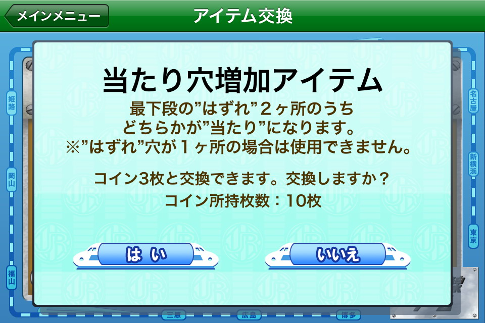 ![]() | 当たり穴増加アイテム : コイン3枚 最下段の“はずれ”2ヶ所のうちどちらかが“当たり”になります。 ※“はずれ”穴が1ヶ所の場合は使用できません。 |